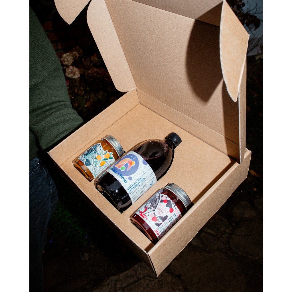 Krabice má pevnou konstrukci a stylový polep, díky kterému vypadá dárkově už bez jakékoliv další výzdoby. Je navržená tak, aby přesně pojala buď tři malé sirupy (0,33 l), nebo jeden velký sirup (0,54 l) a dvě marmelády (200 g).