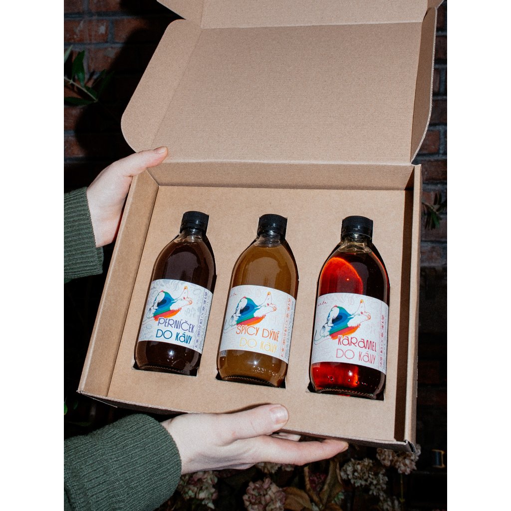 Stylová dárková krabice s designovým polepem, do které si můžete sami nakombinovat obsah. Padne na 3× sirup do kávy 330 ml nebo na kombinaci 1× velký sirup 540 ml a 2× marmeláda 200 g.