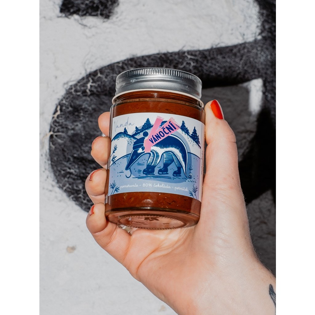 Složení: pomeranče bez chemického ošetření 50 %, vývar z pomerančů 12 %, cukr 30 %, 80% belgická čokoláda 8 %, výluh z BIO perníkového koření, antioxidant kyselina citronová, citrusový pektin.